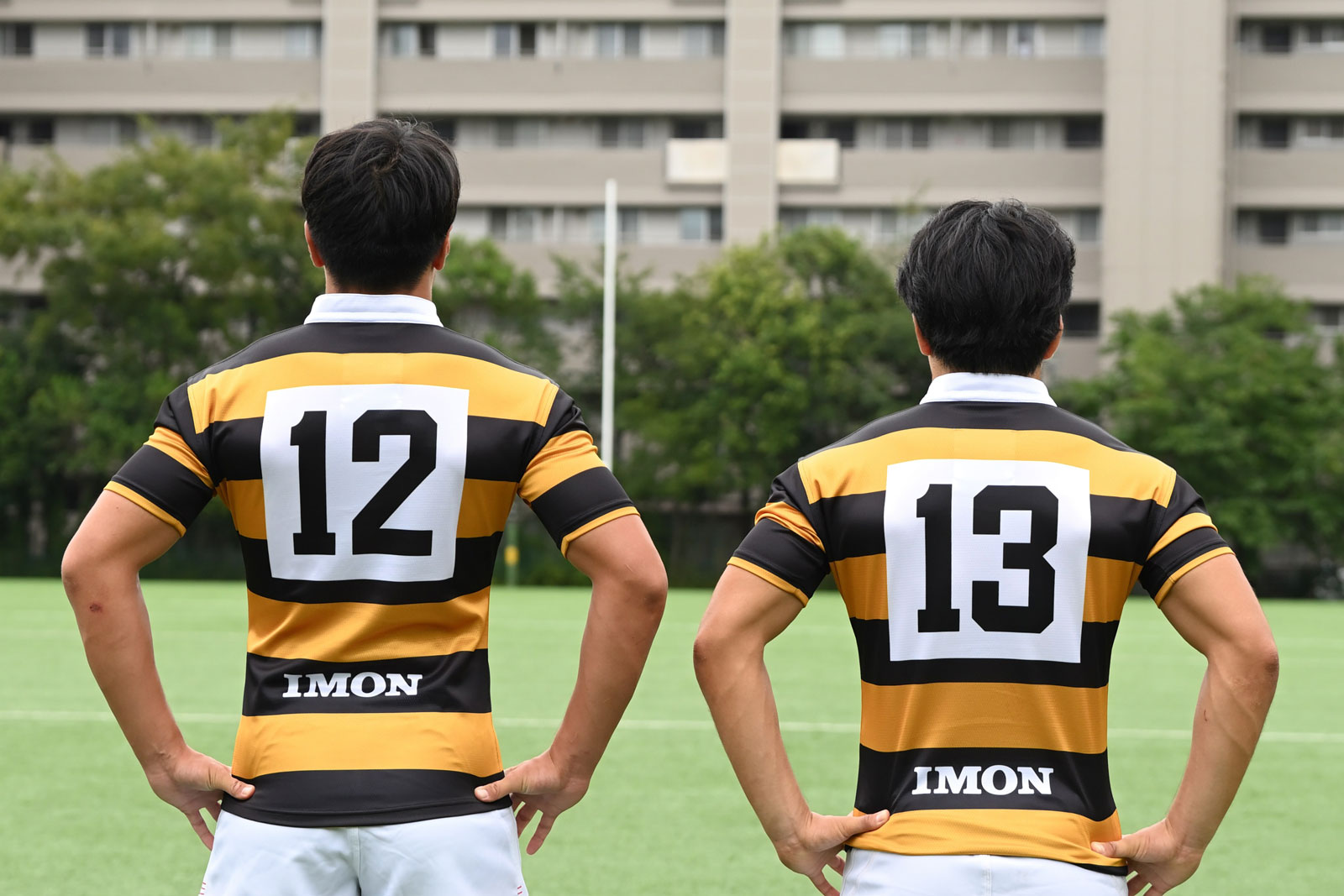 新しいユニフォームは、伝統的な黒と黄色のジャージを基調とし、胸に「リポビタンD」、背中に「IMON」のロゴを配したデザインとなります。(写真左:今野椋平主将/右:山本大悟副将)
